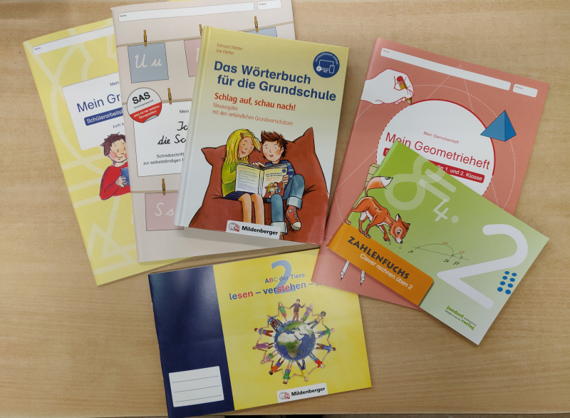 Im Deutschunterricht fahren die Kinder mit dem zweiten Teil des Arbeitsheftes "lesen - verstehen - malen" aus dem "ABC der Tiere" vom Mildenberger Verlag fort. Die Fibel und die Druckschreibhefte aus dem 1. Schuljahr bleibt häufig Begleiter der Kinder. Um die Schreibschrift zu erlernen und zu üben nutzen wir das "Ich kann die Schreibschrift" Übungsheft vom Sternchenverlag in der SAS (Schulausgangsschrift). Ebenfalls vom Sternchenverlag kommt das "Mein Grammatikheft 1/2" hinzu. Da die Kinder nun zunehmend eigene Gedanken verschriftlichen wird auch ein Wörterbuch notwenig. Wir nutzen aufgrund der klaren Struktur und Verwendbarkeit in allen folgenden Schuljahren das "Schlag auf, schau nach" vom Mildenberger Verlag.